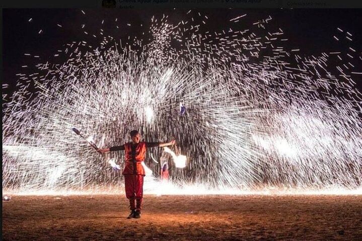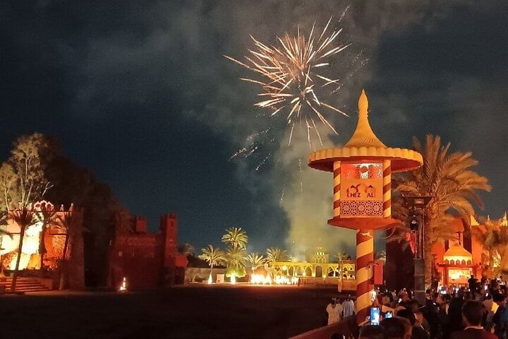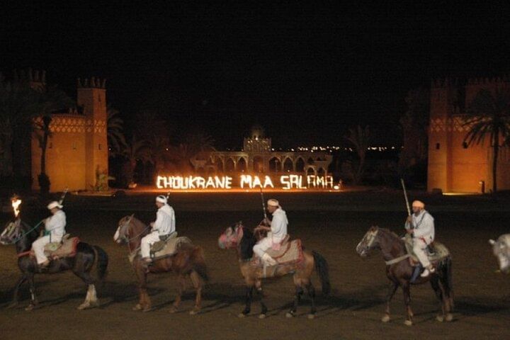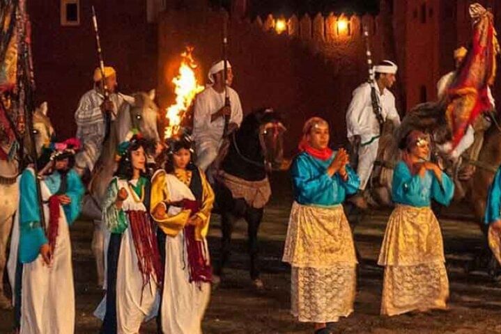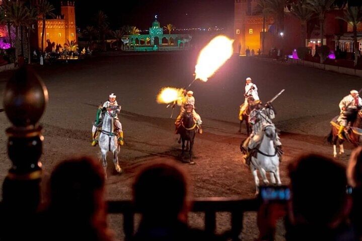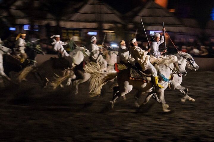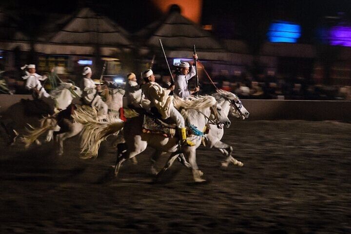 As you dine, the atmosphere comes alive with traditional music and folkloric performances, setting the stage for the night’s main attraction – the legendary Fantasia Show. Marvel at skilled horsemen performing daring stunts, while dancers, drummers, and musicians revive ancient Moroccan stories beneath the stars. Fireworks, colorful costumes, and dramatic storytelling create a mesmerizing experience that lingers long after the final applause.