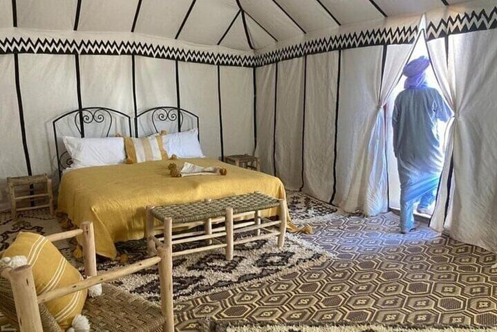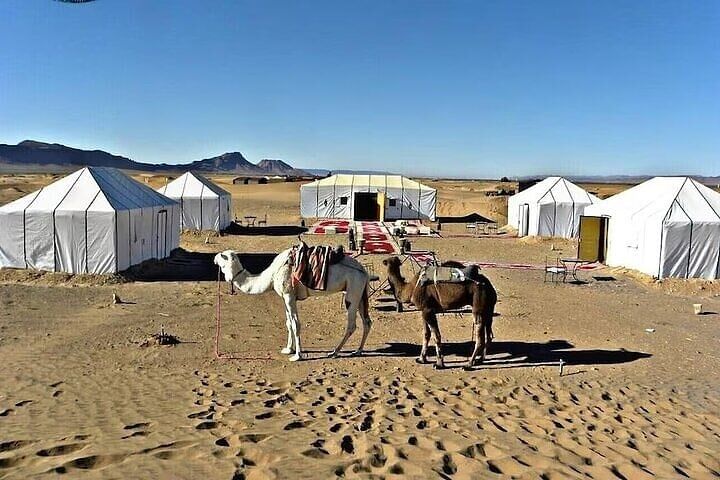 Continue through scenic valleys to Zagora, where a sunset camel ride across golden dunes awaits. Spend the night in a premium desert camp, relaxing in a private tent with an en-suite bathroom, modern comforts, and authentic Berber charm.