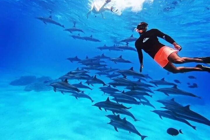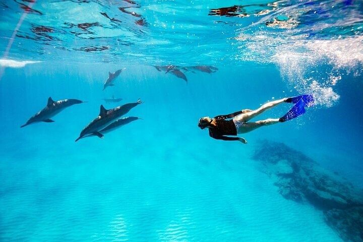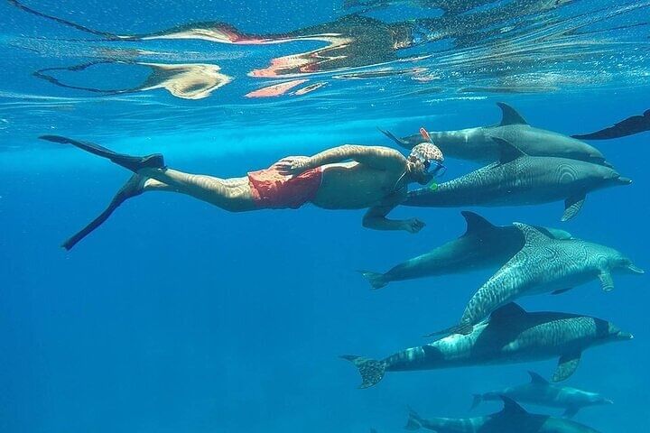 Dive into crystal-clear waters to swim freely with dolphins in their natural habitat, then snorkel vibrant coral reefs near El Gouna, teeming with exotic marine life. This tour follows ethical, eco-conscious guidelines approved by HEPCA, ensuring dolphin encounters are both magical and responsible.